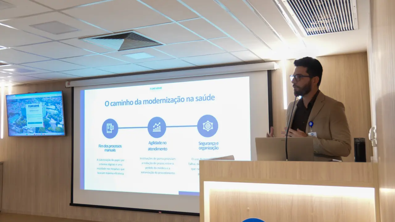 Com 46 salas cirúrgicas e mais de 39.500 procedimentos realizados nos últimos 12 meses, o Complexo Funfarme demanda de um ecossistema de gestão estruturado. O coordenador do Núcleo de Planejamento Cirúrgico, Pablo Maia, apresentou os detalhes técnicos e destacou o fim da dependência de processos físicos. "Temos uma estrutura de ponta, com tecnologias como o Robô Da Vinci Xi e o microscópio Kinevo 900, então o agendamento precisa estar à altura dessa modernidade. A plataforma irá padronizar a comunicação e colocar o paciente no centro, evitando cancelamentos e garantindo que ele seja informado sobre cada etapa de sua jornada", afirmou Pablo.